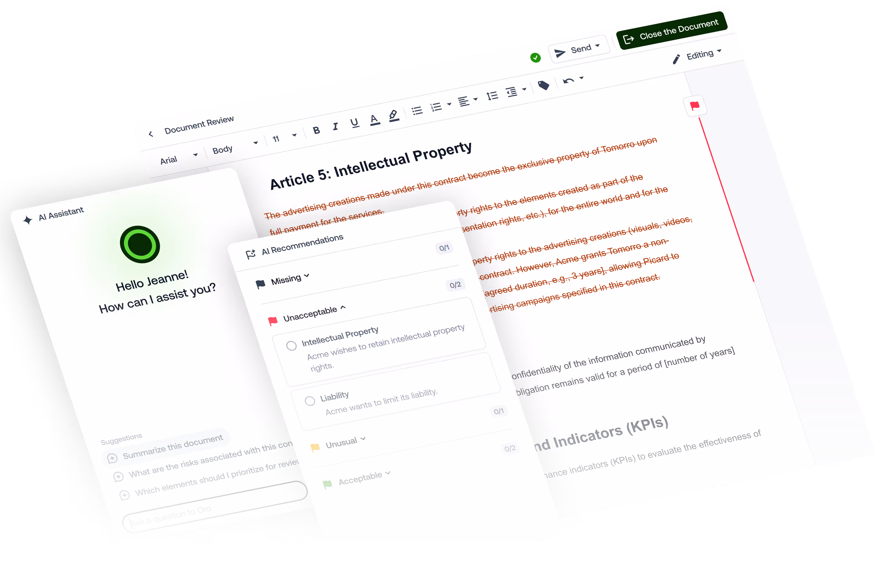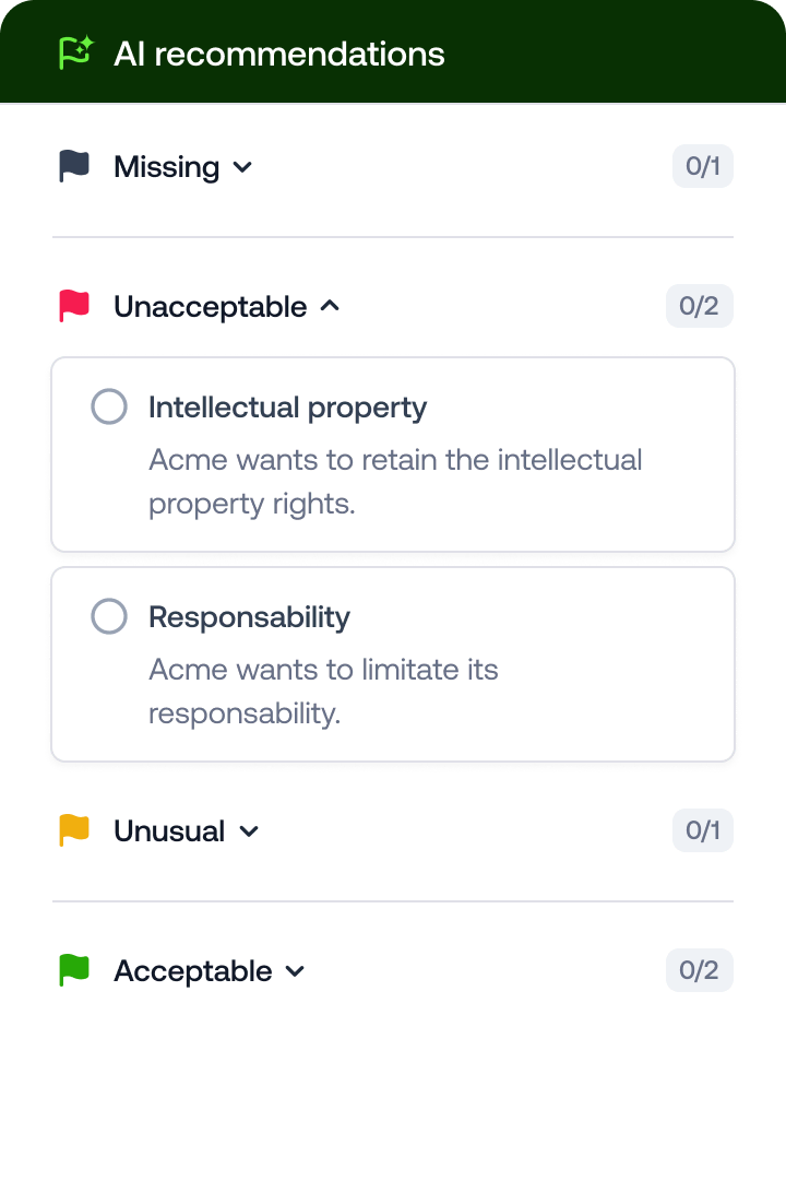 Speed up your document review with Oro. It highlights areas to watch out for and gives recommendations based on your contractual policy.